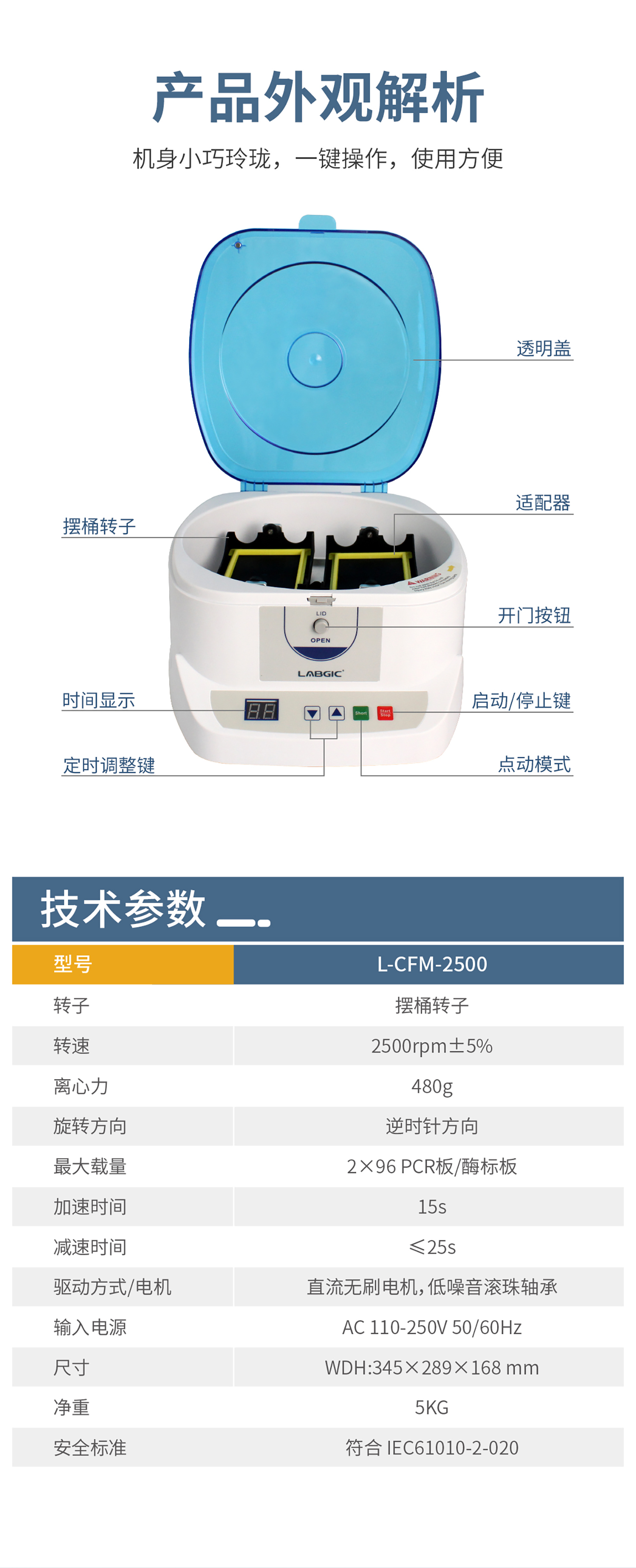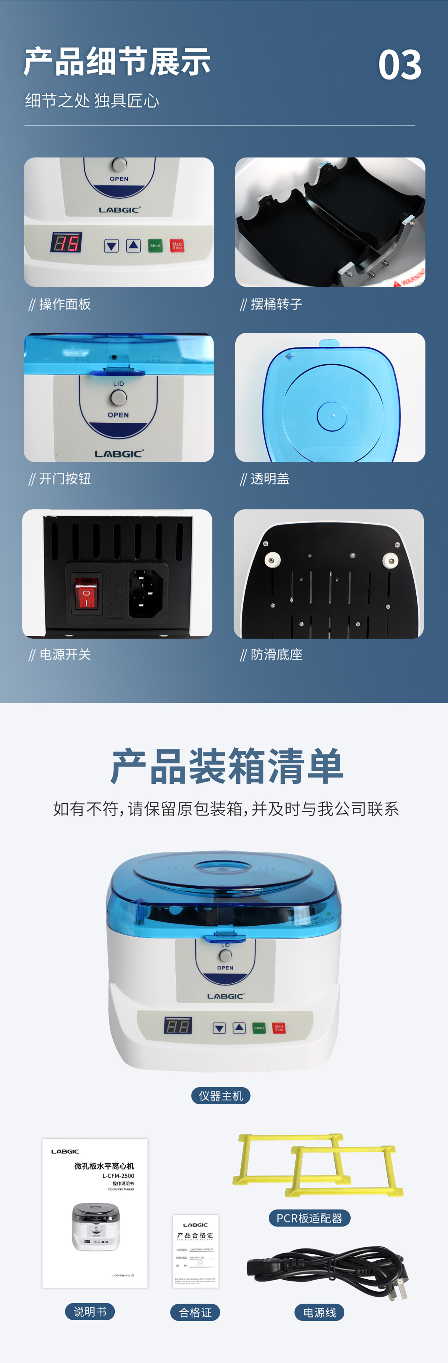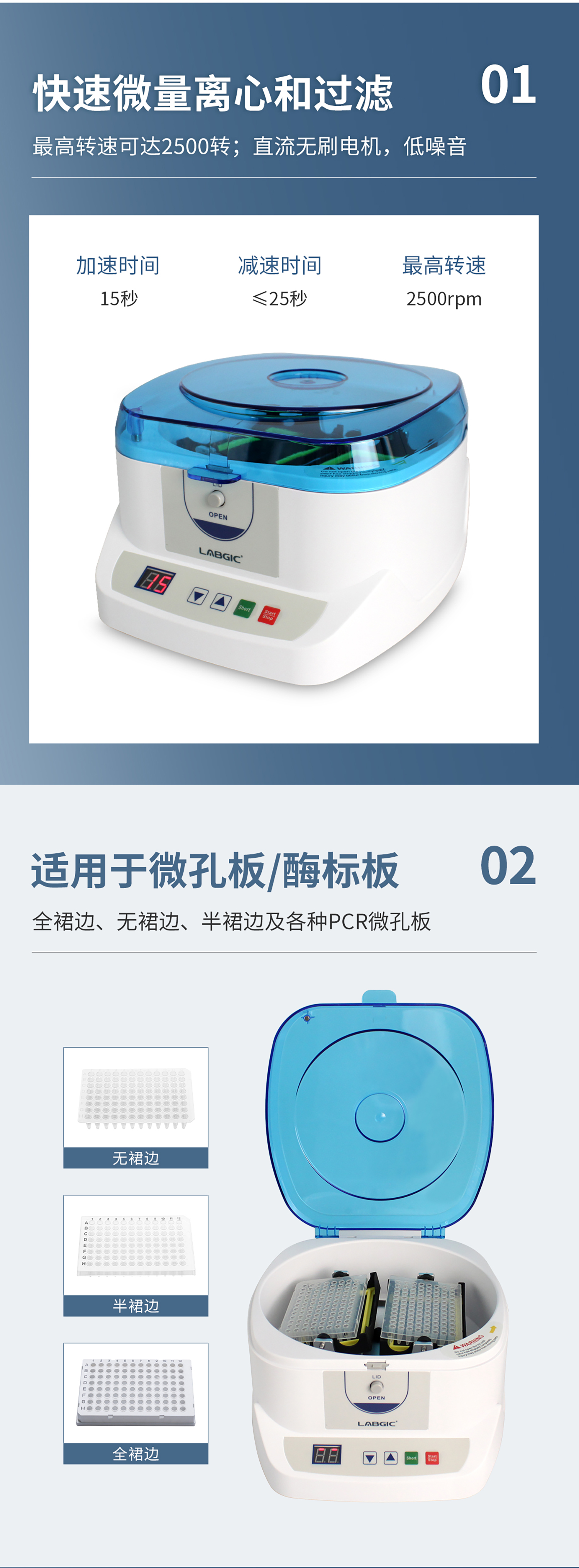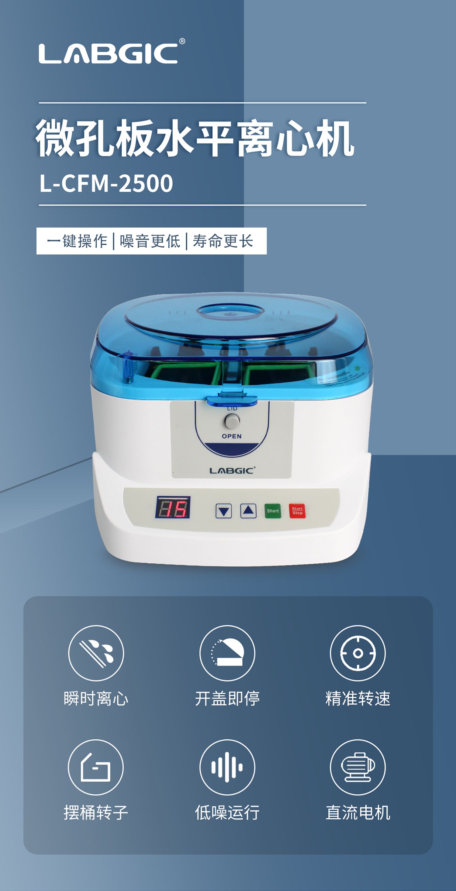 本产品为微孔板水平离心机,是一款实用、可靠的实验室工作助手,最高转速可达2500转。机身小巧玲珑,一键操作;操作过程中如果盖子打开,转子立即停止;交流宽压供电,110-250V AC,使用方便;低噪音,长寿命。特别适合用于快速微量离心和微量过滤。