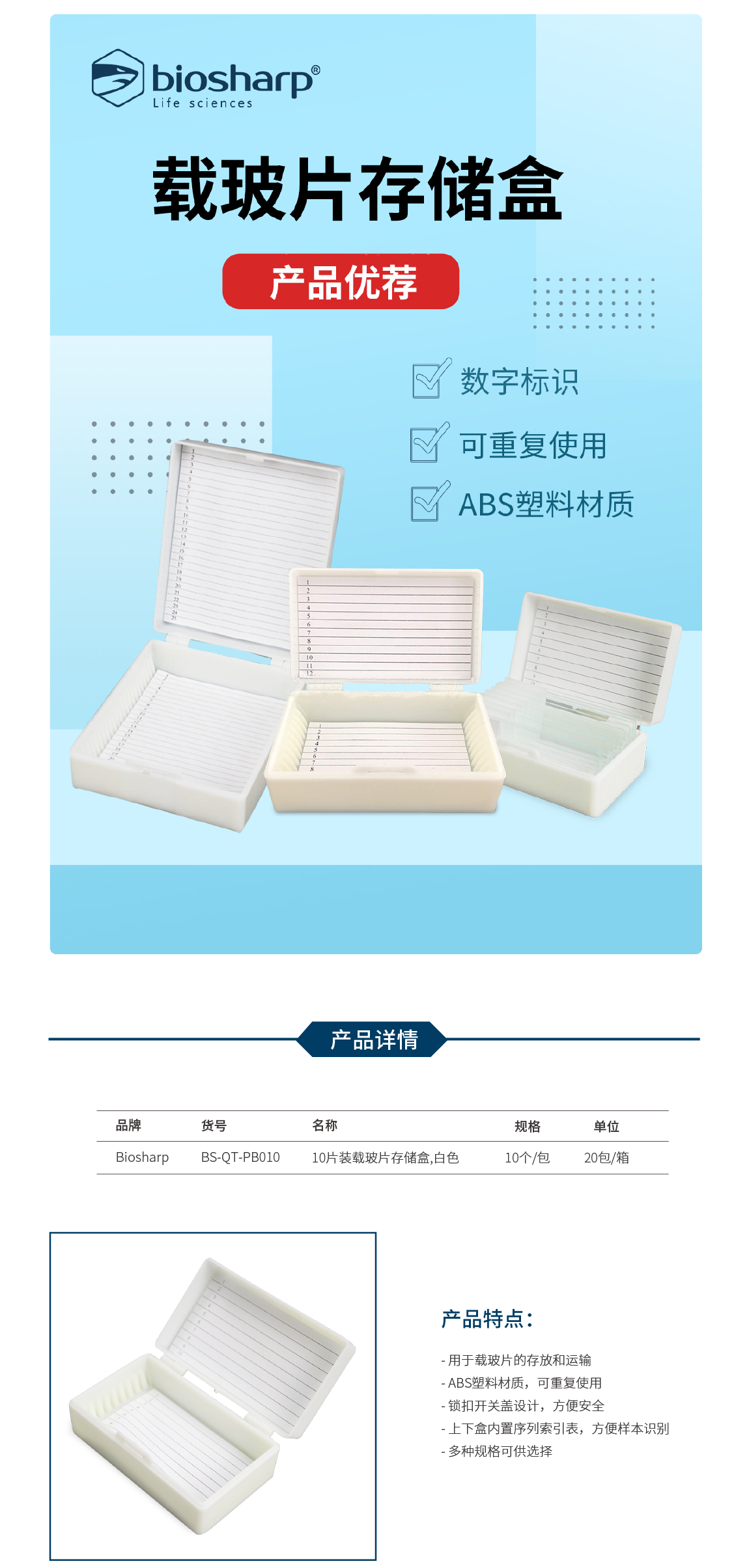 10片装载玻片存储盒,白色 BS-QT-PB010