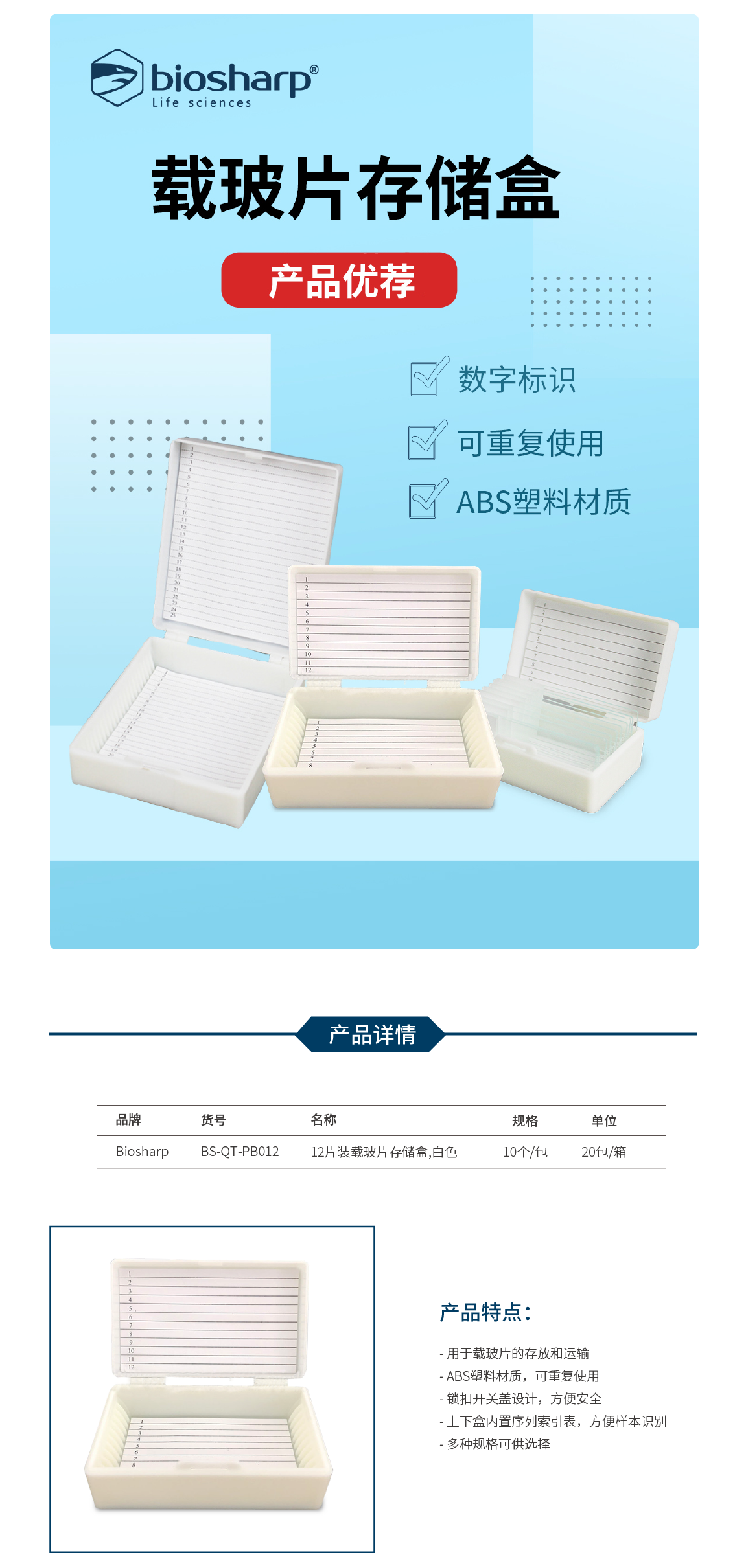 12片装载玻片存储盒,白色 BS-QT-PB012