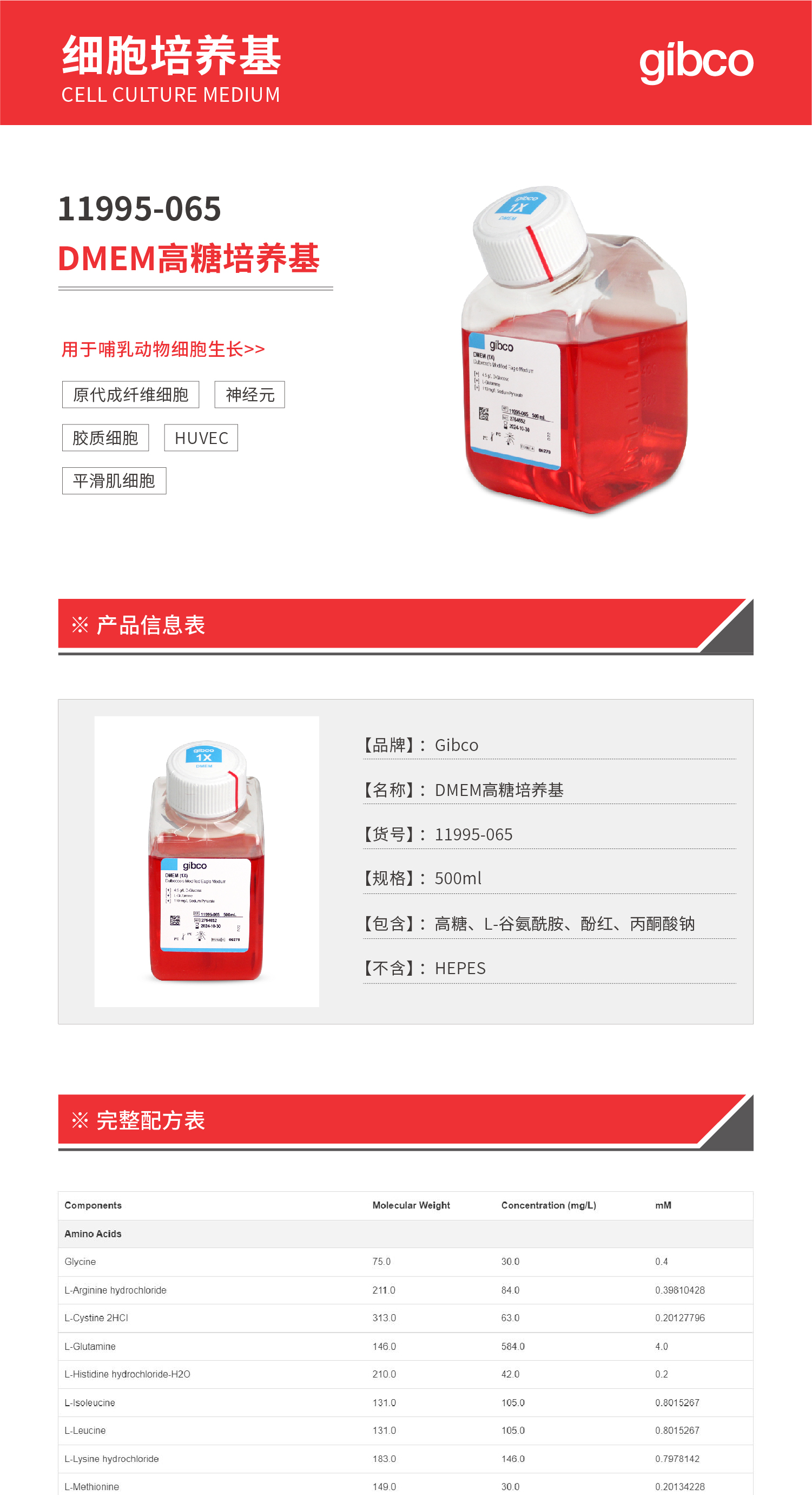 DMEM高糖培养基(含L-谷氨酰胺, 11995-065