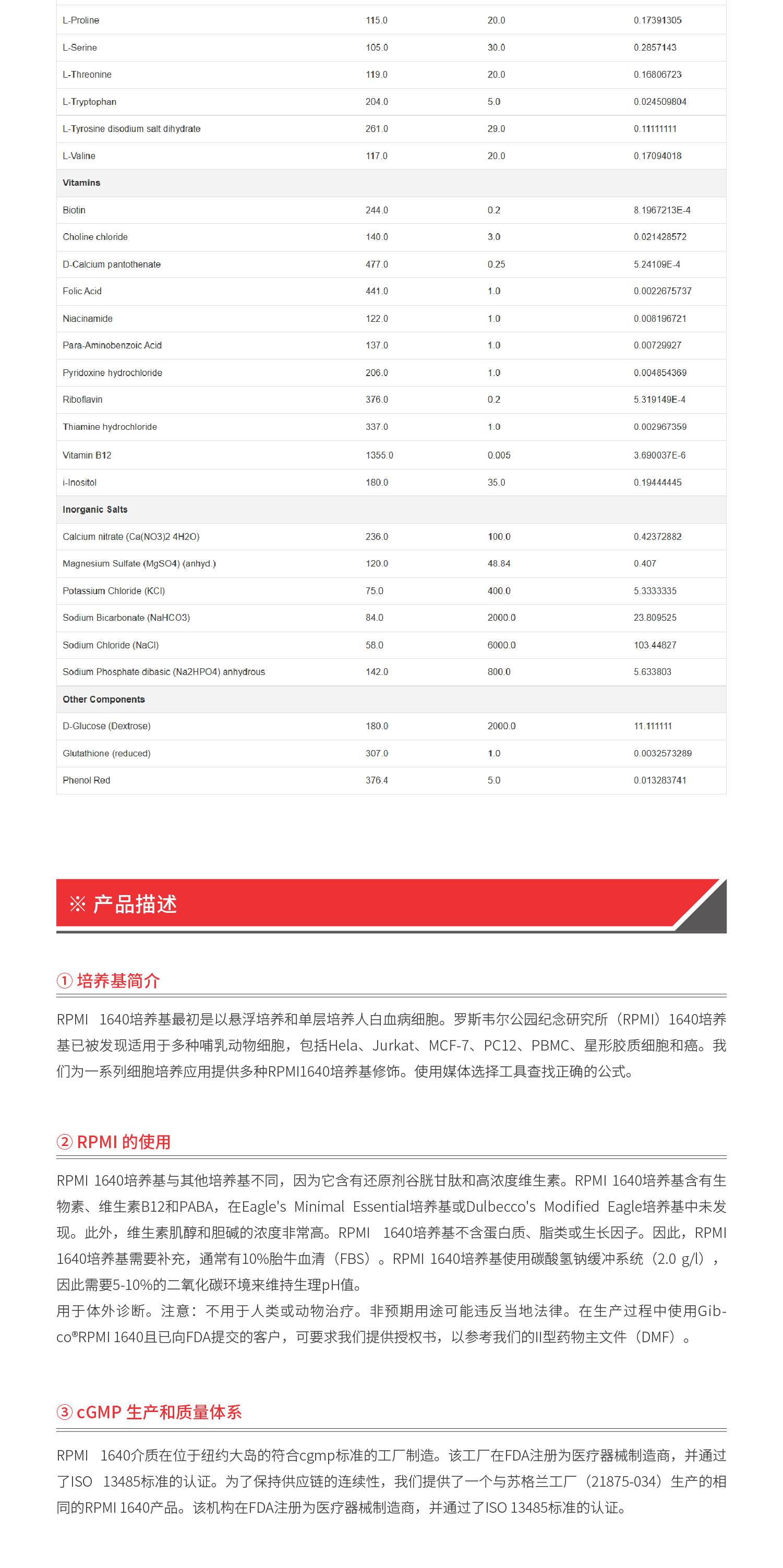 RPMI1640培养基与其他培养基不同,因为它含有还原剂谷胱甘肽和高浓度维生素。RPMI1640培养基含有生物素、维生素B12和PABA,在Eagle's Minimal Essential培养基或Dulbecco's Modified Eagle培养基中未发现。此外,维生素肌醇和胆碱的浓度非常高。RPMI1640培养基不含蛋白质、脂类或生长因子。因此,RPMI 1640培养基需要补充,通常有10%胎牛血清(FBS)。RPMI 1640培养基使用碳酸氢钠缓冲系统(2.0 g/l),因此需要5-10%的二氧化碳环境来维持生理pH值。