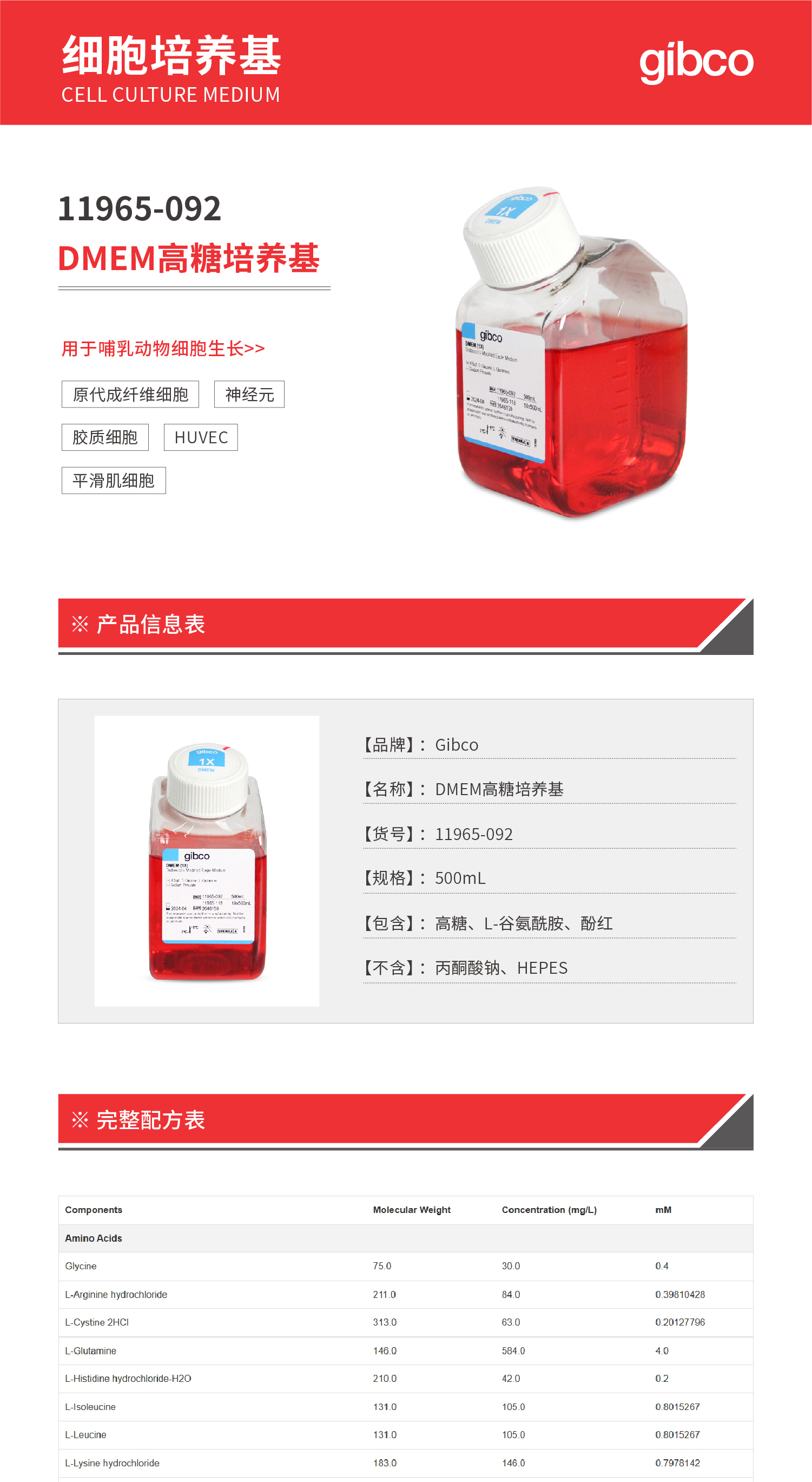 DMEM高糖培养基(含L-谷氨酰胺,不含丙酮酸钠,HEPES) 11965-092
