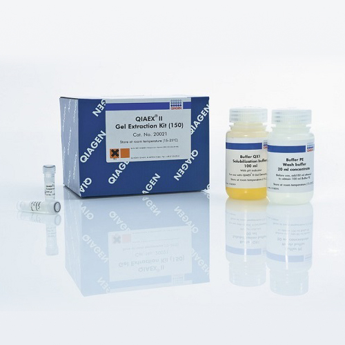 QIAEX II Gel Extraction Kit提供硅胶颗粒悬浮液,在离液盐存在的条件下,DNA片段结合到硅胶颗粒上。QIAEX II Suspension添加到溶液或溶解的琼脂糖凝胶中结合DNA。通过简单的离心操作收集硅胶颗粒,洗涤后用Tris缓冲液或纯水洗脱得到40 bp–50 kb的DNA。