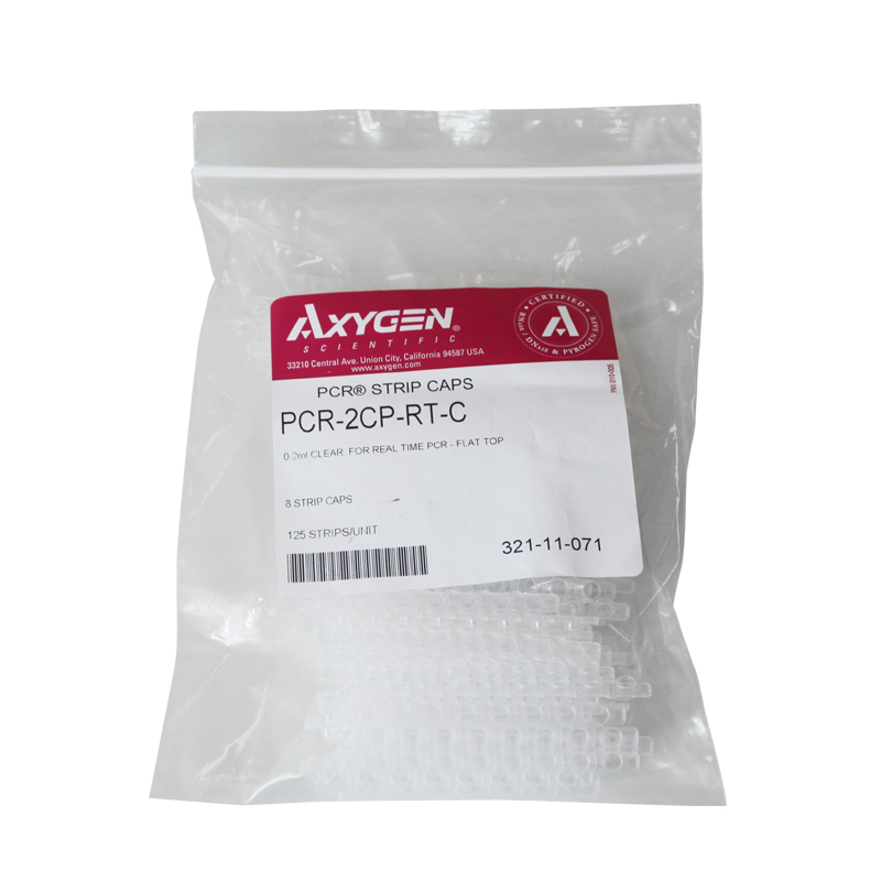 Axygen® 1 x 8 strip flat PCR ultra-clear thin wall caps are designed to fit 8 strip PCR tubes and 96 well PCR microplates. Specifically designed for Real Time PCR.