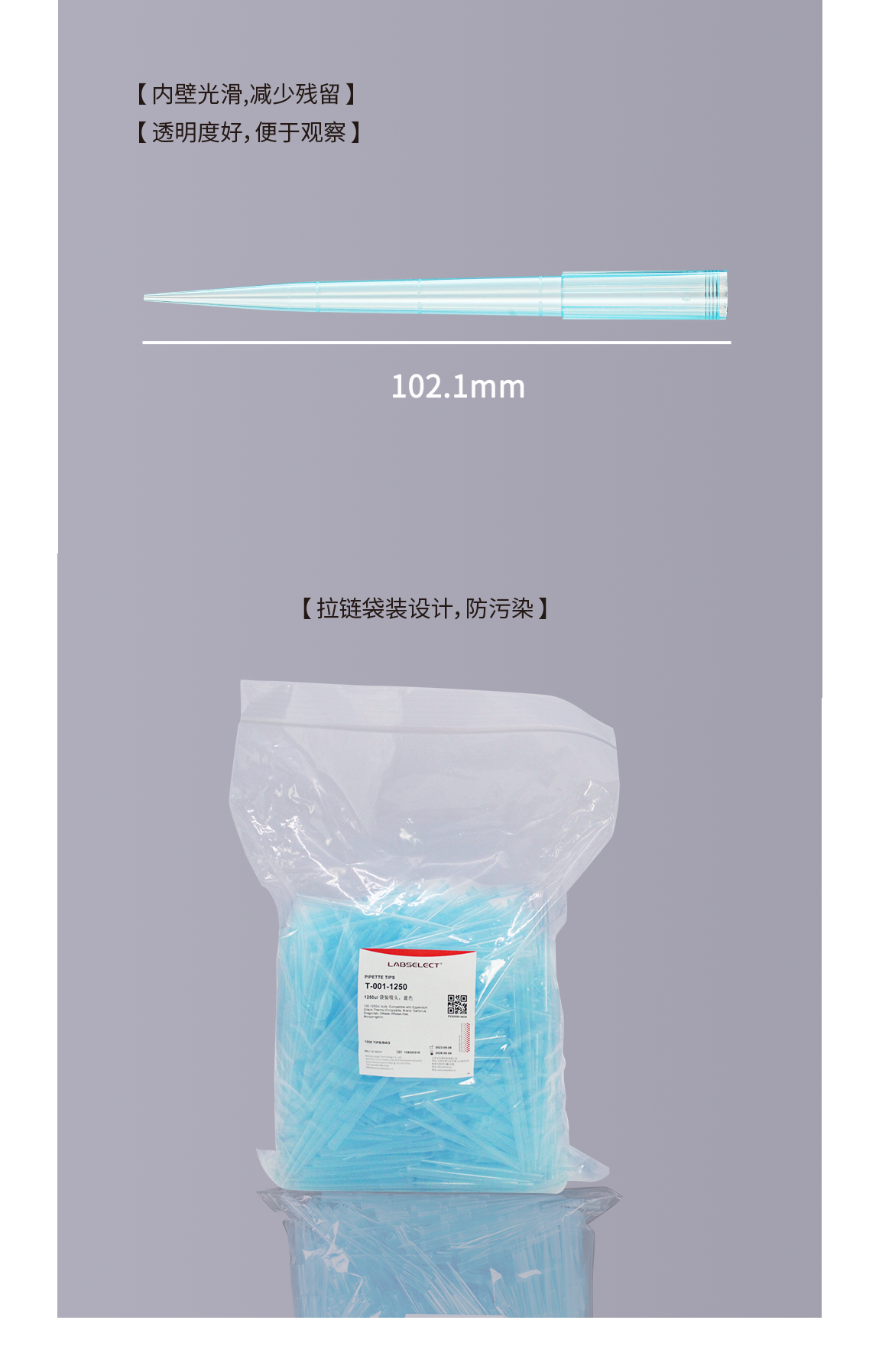 1250ul袋装吸头,蓝色102.1mm T-001-1250
