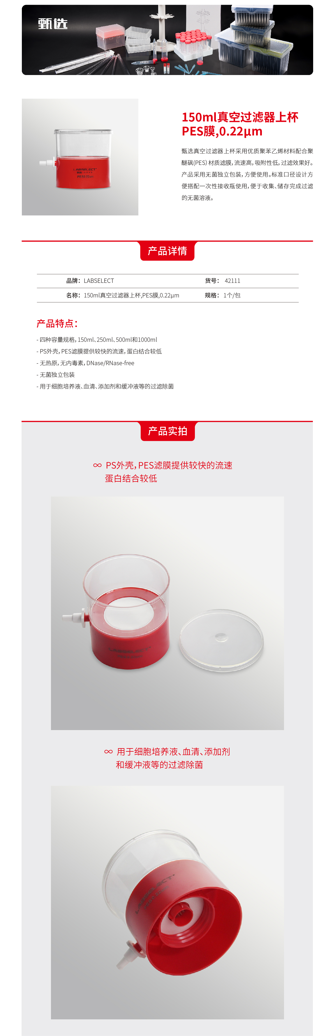 150ml真空过滤器上杯,PES膜,0.22μm 42111