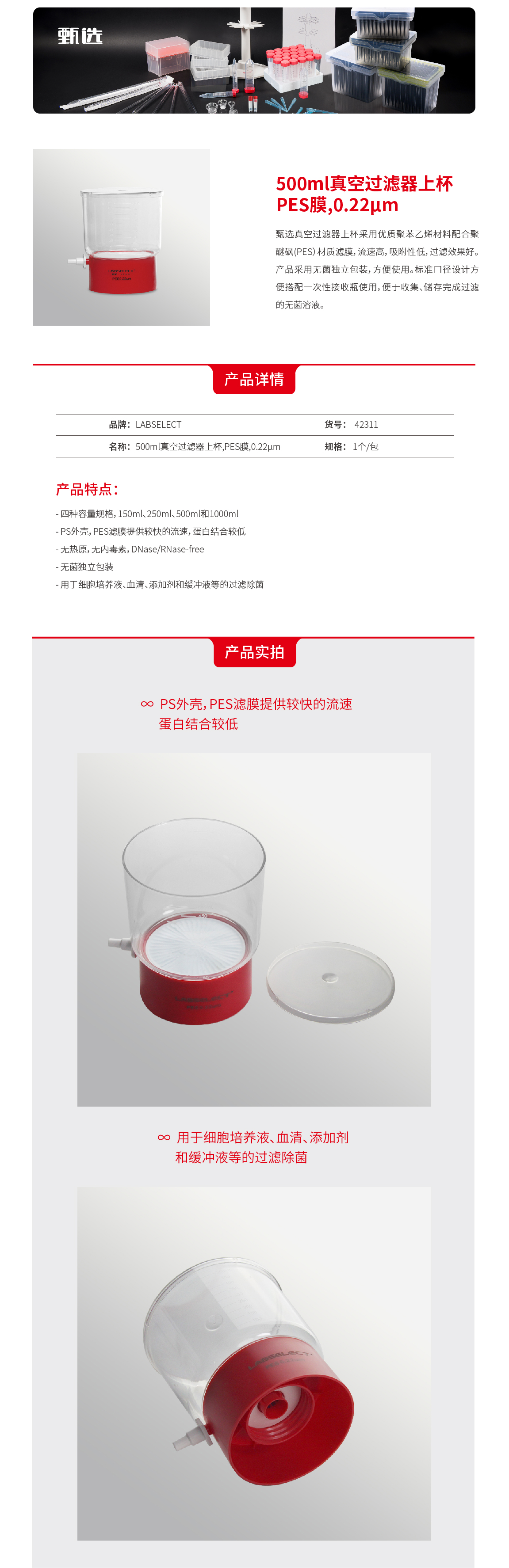 500ml真空过滤器上杯,PES膜,0.22μm 42311