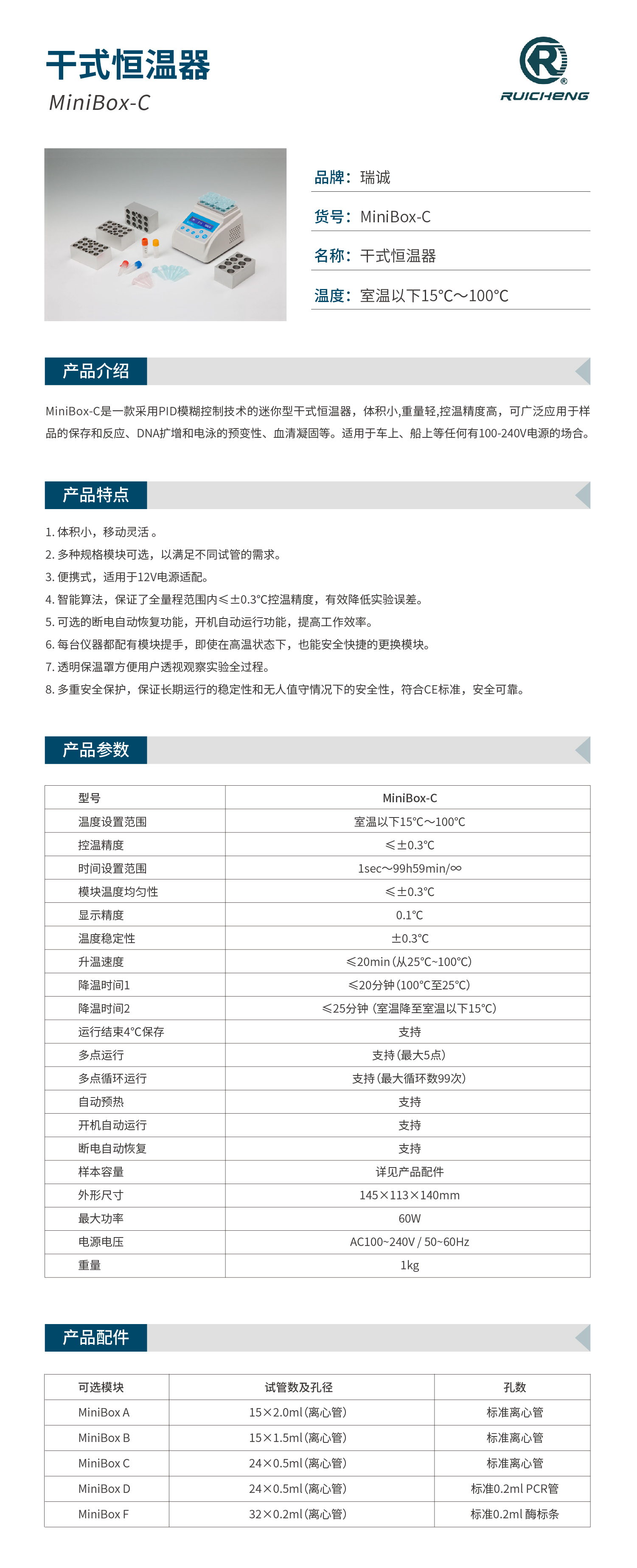 MiniBox / MiniBox-C是一款采用PID模糊控制技术的迷你型干式恒温器,体积小,重量轻,控温精度高,可广泛应用于样品的保存和反应、DNA扩增和电泳的预变性、血清凝固等。适用于车上、船上等任何有100-240V电源的场合。