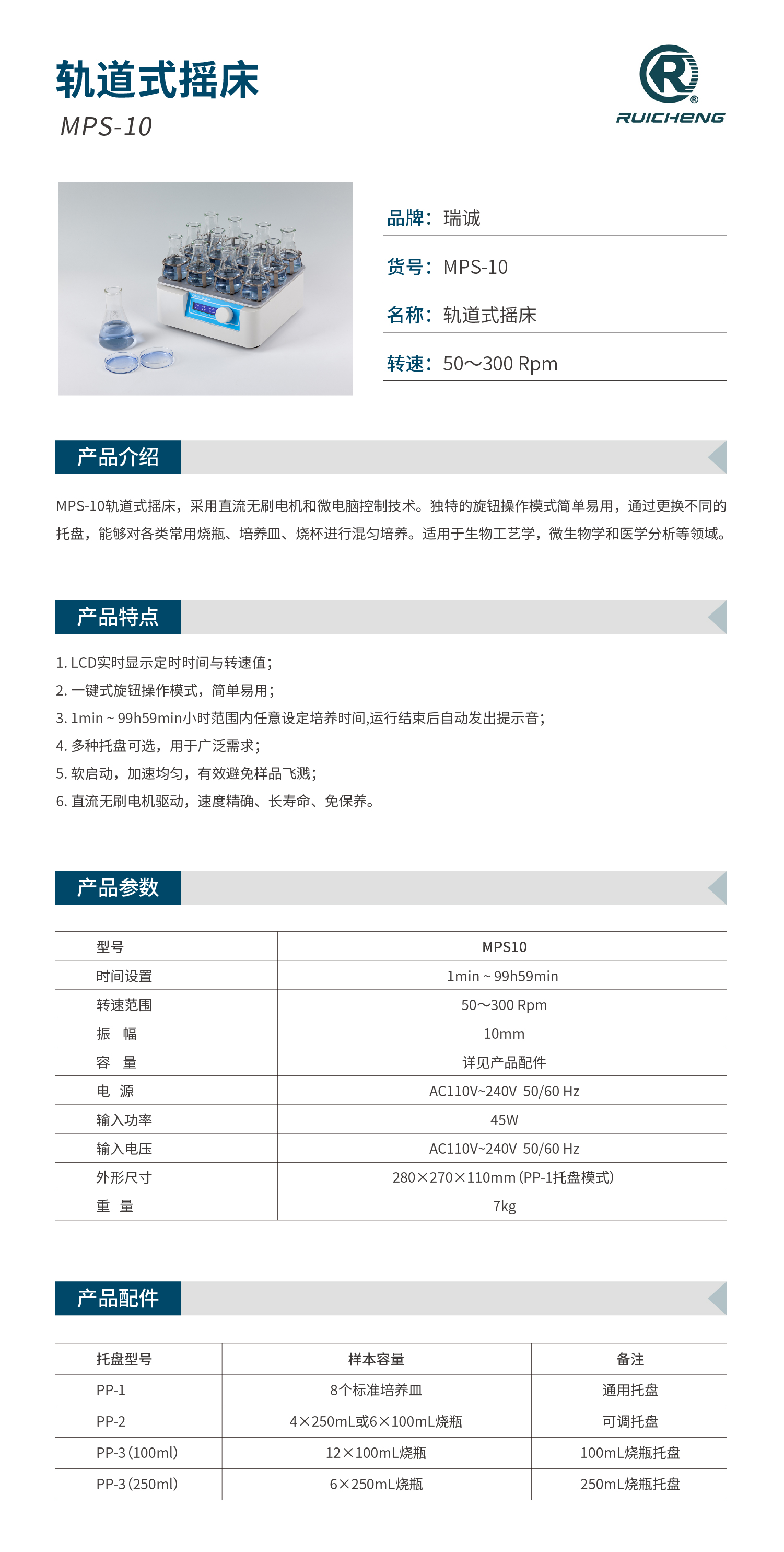 MPS-10轨道式摇床,采用直流无刷电机和微电脑控制技术。独特的旋钮操作模式简单易用,通过更换不同的托盘,能够对各类常用烧瓶、培养皿、烧杯进行混匀培养。适用于生物工艺学,微生物学和医学分析等领域。