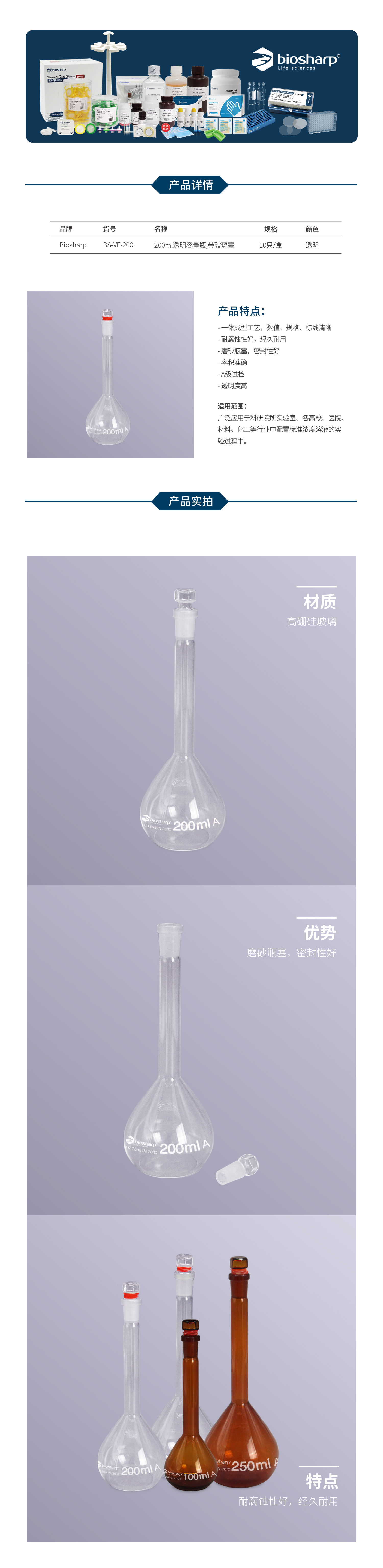 200ml透明容量瓶,带玻璃塞 BS-VF-200