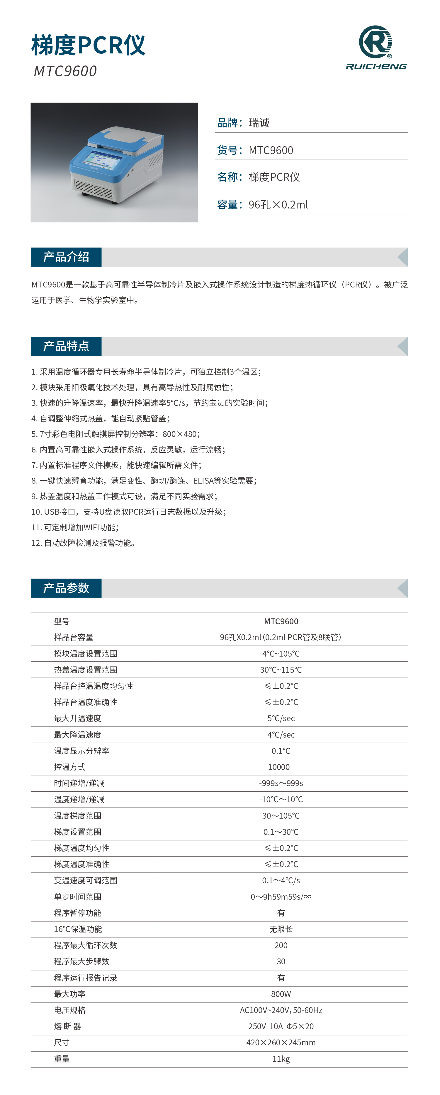 MTC9600是一款基于高可靠性半导体制冷片及嵌入式操作系统设计制造的梯度热循环仪(PCR仪)。被广泛运用于医学、生物学实验室中。